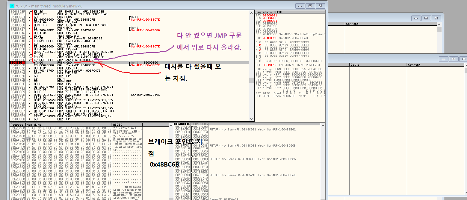 그렇다면 대사를 다 쓸 경우 JMP 밑에 있는 0x48BC6B로 오게 될 것이다. 따라서 대사 브레이크 포인트 지점은 0x48BC6B다.