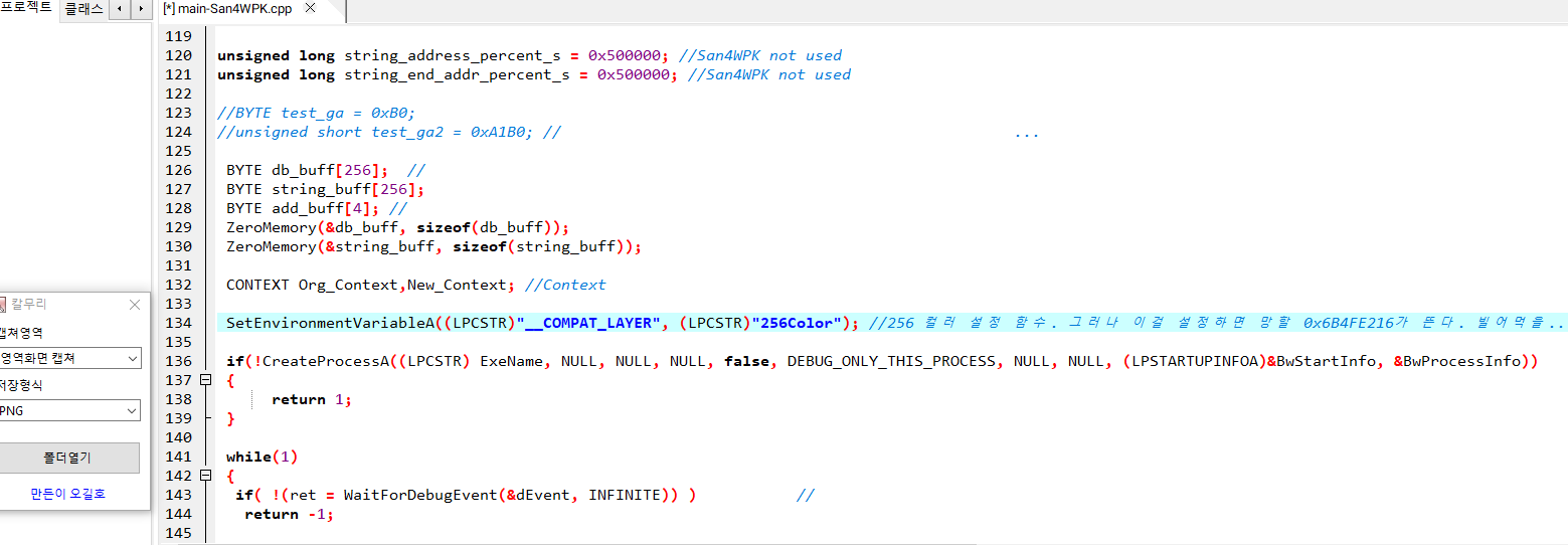 어쩌면 런처에서 256컬러 모드 세팅을 하면 어떨까? 하는 생각으로 런처에 관련 코드를 넣어보았지만 똑같이 0x6B4FE216에서 오류가 뜨고 튕겼다.