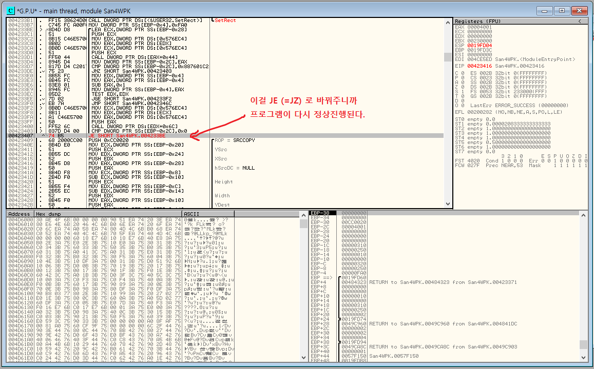 그래서 JNZ...의 반대 구문인 JE (=JZ) 로 바꿔주니까 프로그램이 위로 점프하지 않고 아래쪽으로 내려가면서 정상적으로 계속 실행되었다.
