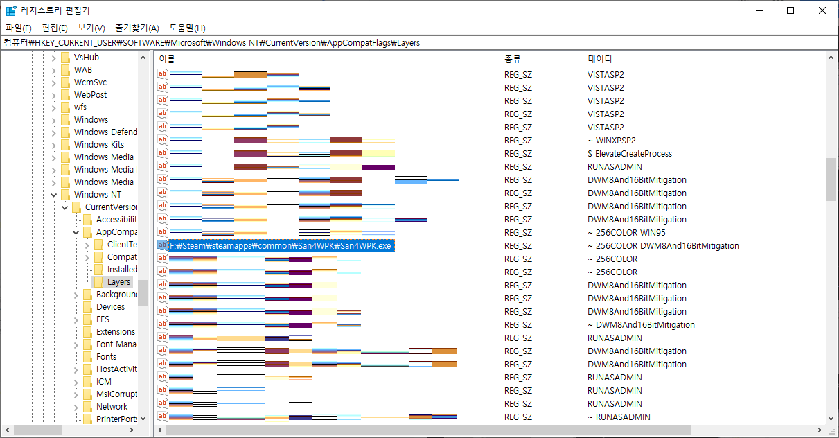 그래서 호환성 탭을 담당하는 레지스트리 주소에 들어가보니... 삼국지4PK가 등록이 된 것을 확인할 수 있었다.