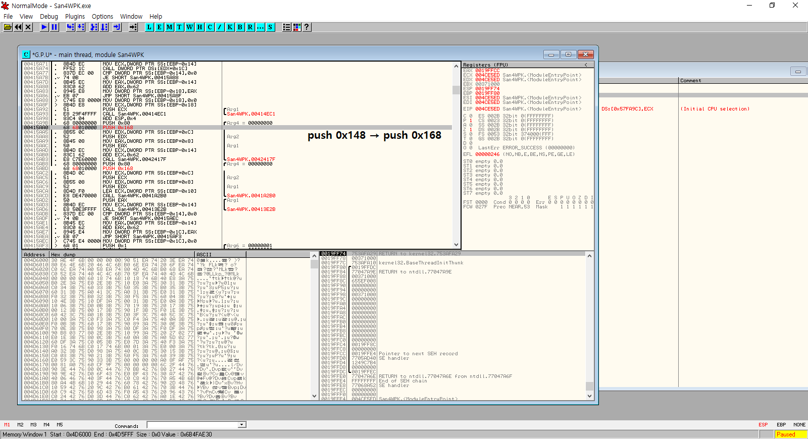 PUSH 0x148을 PUSH 0x168로 변경.