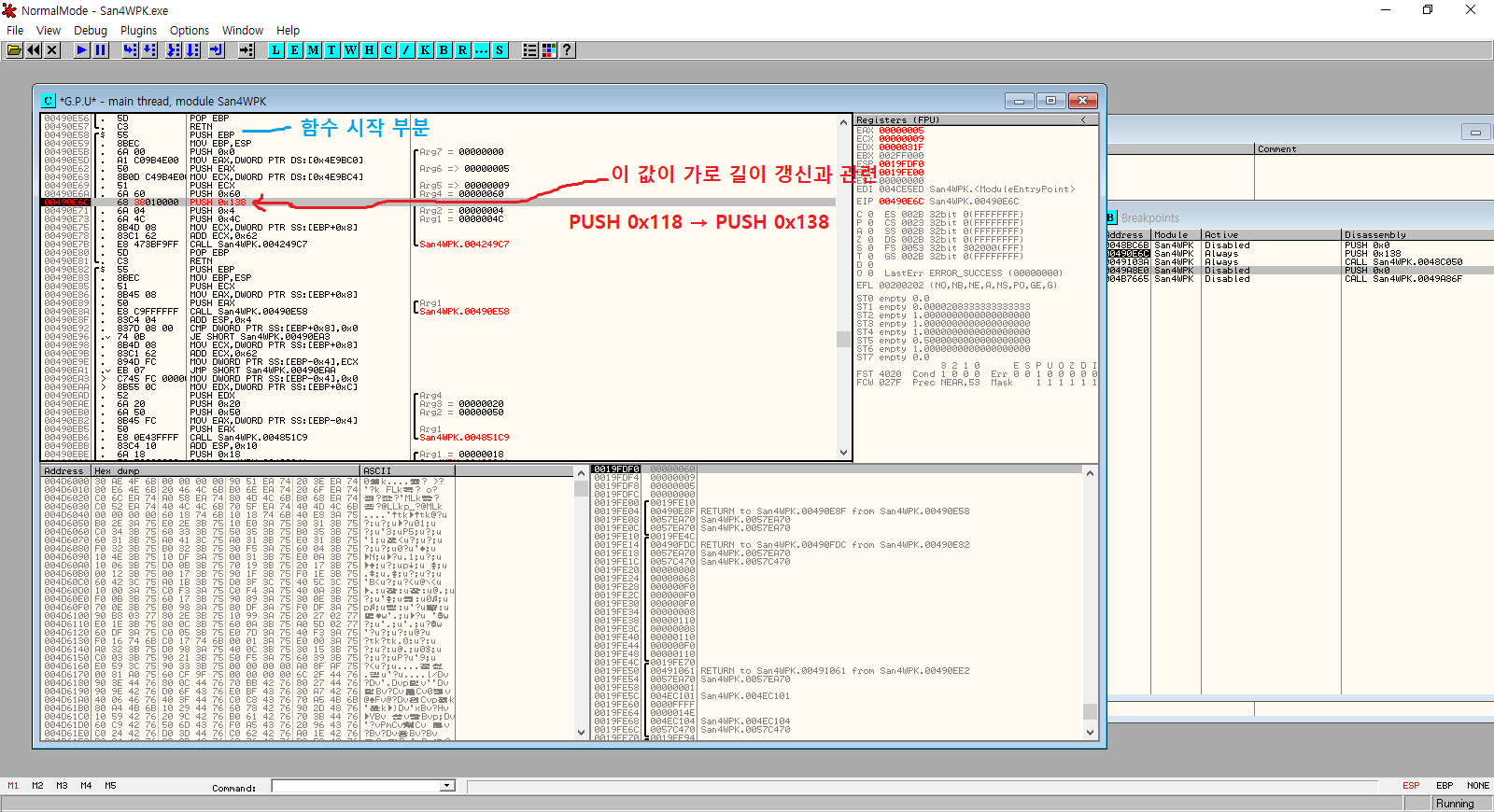 그래서 이벤트 메시지 확장 관련 주소였던 00490F9E에서 그 주변의 CALL 함수들을 조사하는 등 삽질한 결과, 274px가 아닌 280px이 갱신되는 것으로 판명되었다.