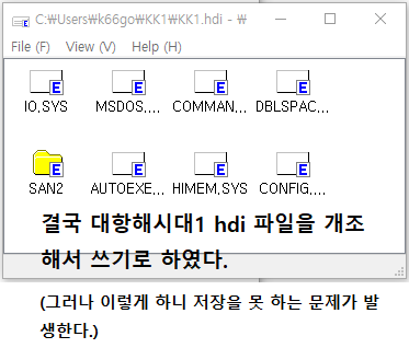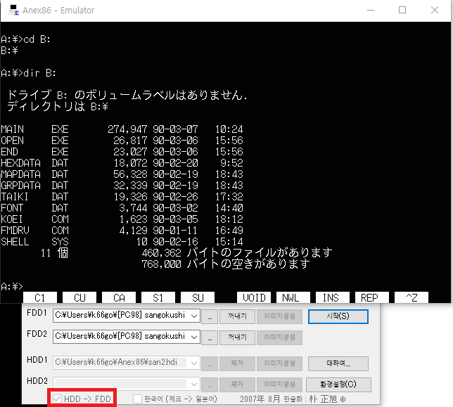 A디스크 내용물을 어떻게든 끄집어내야 한글화가 가능한지 아닌지 확인할 수 있다. 그래서 나는 hdi에 MS-DOS를 설치하고, DOS 상에서 fdi의 파일을 hdi로 복사하는 식으로 진행하기로 하였다. (참고 링크)