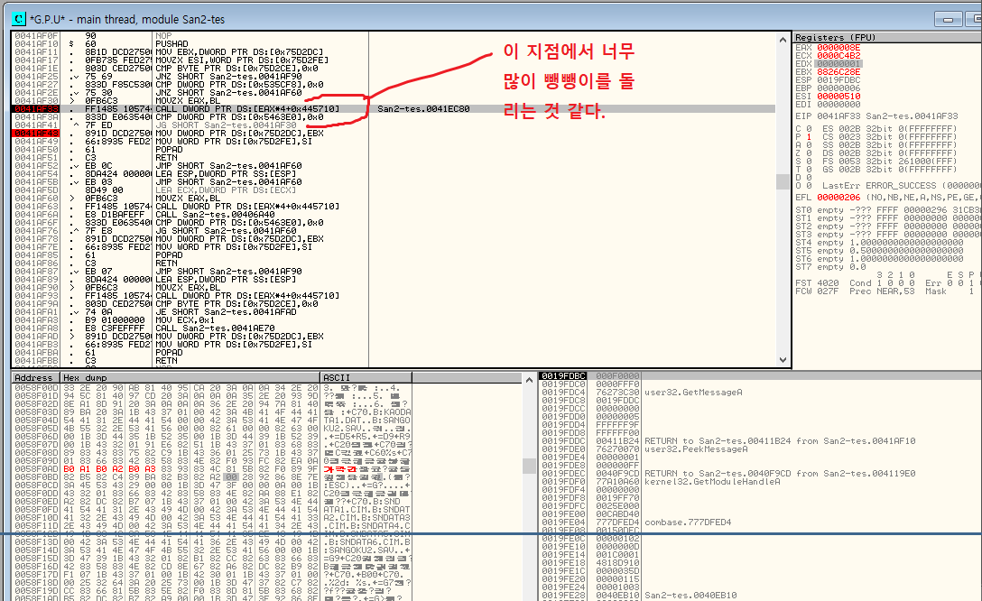 또한, 이 프로그램이 PC98 에뮬레이터 형태라서 그런지 어떤 특정 주소에서 너무 뺑뺑이를 많이 돌린다. 이 때문에 정확히 문자 출력 함수가 어디인지 조차도 파악하지 못했다. TextOutA 함수에 대해 브레이크 포인트를 걸어도 게임은 멈추지 않았다.