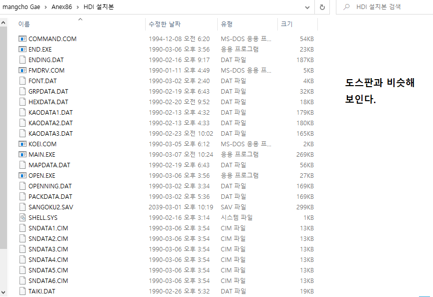 복사 명령어로 삼국지2의 A디스크와 B디스크의 파일을 모두 hdi에 복사했다.