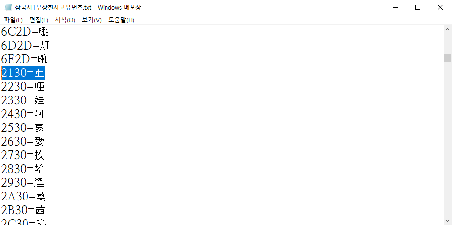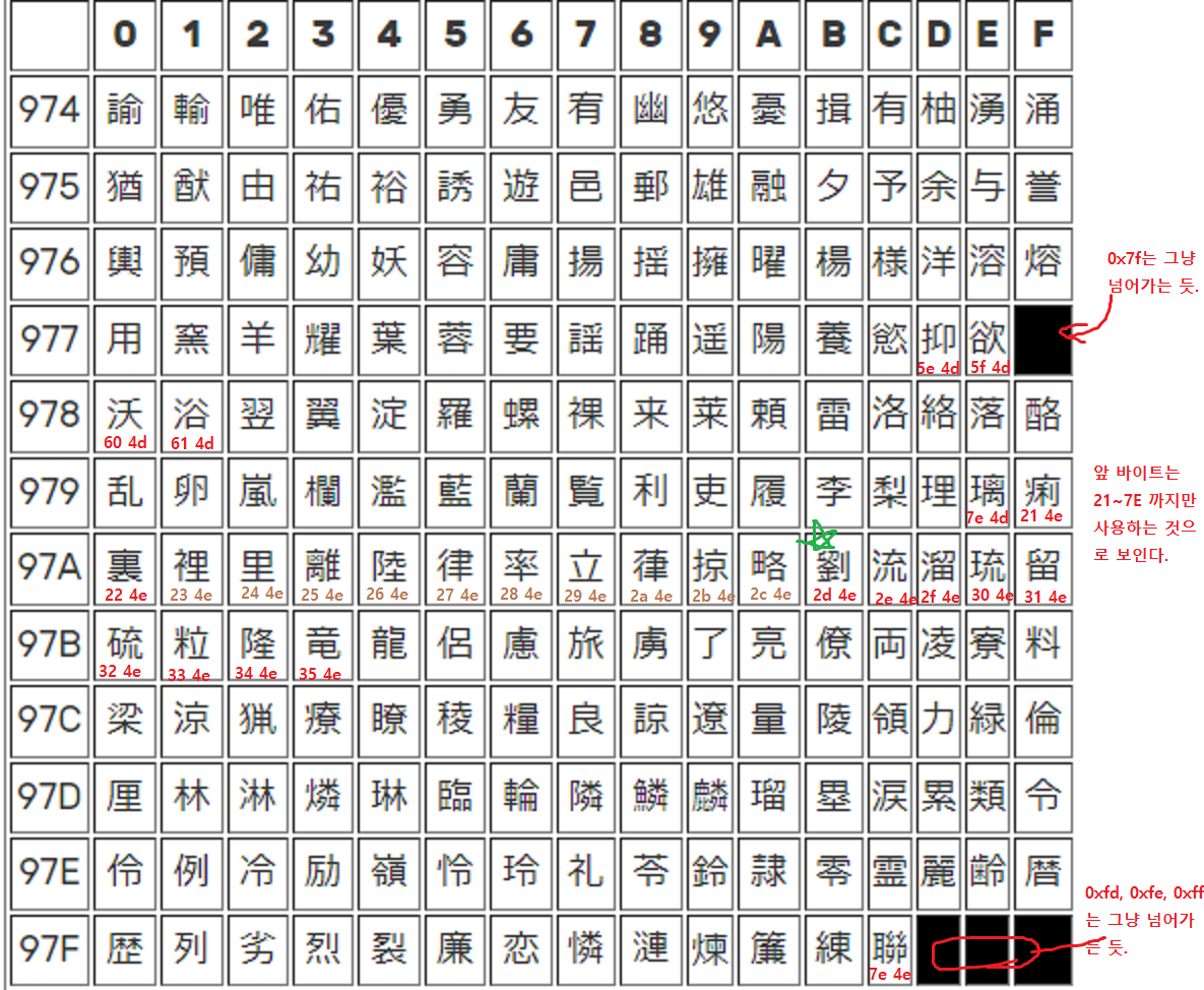 이제 한자 표기용 고유 코드에 대해 분석해야 한다. 답은 노가다 밖에 없다. 계속 바이트를 바꿔가면서 무슨 한자가 뜨는 지 확인하는 것이다.