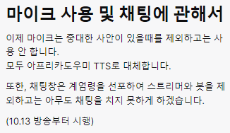 10월 13일 방송부터 마이크 사용을 사실상 폐지하고, 아프리카도우미 TTS로 대체한다... 어차피 내 목소리는 아무도 듣고 싶지 않을 거니까.