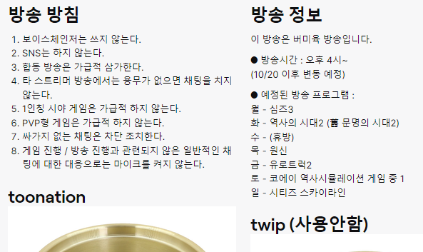 트위치 방송 페이지에 방송 방침과 방송 정보를 추가하였다.