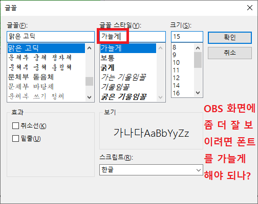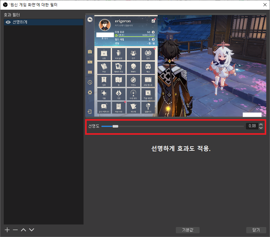 결국 이건 'OBS 효과 필터 - 선명하게' 를 적용시키기로 하였다. 기본값인 0.08을 적용했다.
