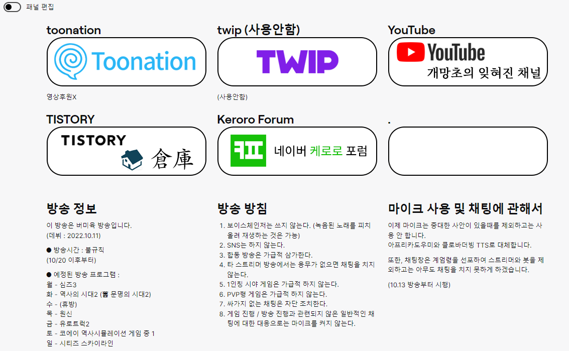 그리고 버튼으로는 투네이션, 트윕, 유튜브 채널, 티스토리 (현재 이 블로그), 케로로 포럼, 빈 버튼 이렇게 6개를 등록했다.