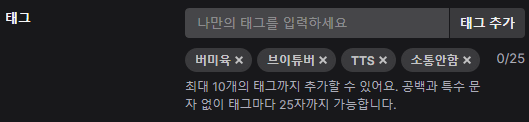 브이튜버는 나처럼 버추얼 캐릭터를 가지고 방송을 하는 사람들이 흔히 쓰는 태그다. 이걸 달지 않으면 방송에 찾아오기가 힘들다고 한다. 데뷔 당일에도 있었던 태그라서 다시 추가한다.