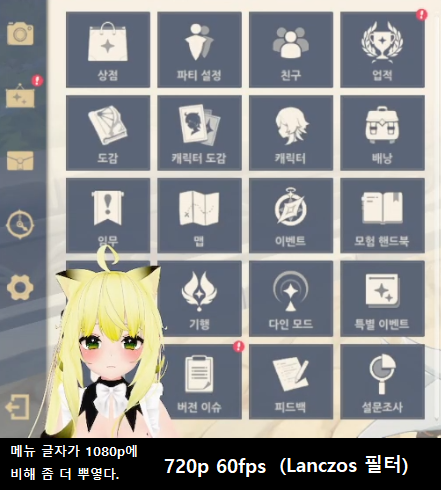 720p 60fps 녹화 영상은 1080p 30fps 녹화 영상에 비해 메뉴 글자들이 살짝 뿌옇게 나오고 있었다. 원신 해상도도 1280x720 창모드로 실행한 건데 왜 이러는 거지?