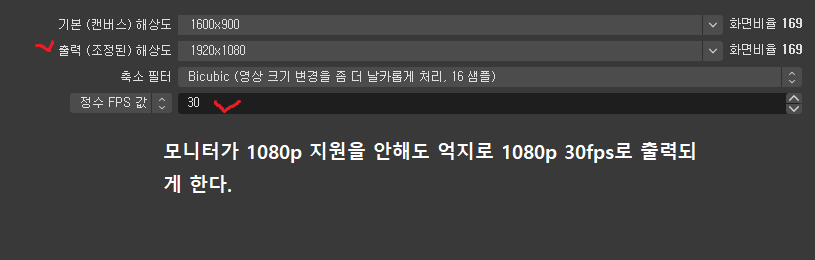 이유가 뭔지 생각하다가 혹시 720p라서 그런가 싶어서, 출력을 1080p 30fps로 바꿔보기로 하였다.