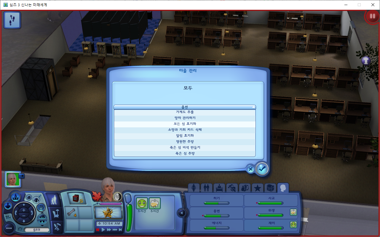 마스터 컨트롤러 모드 설치 후 아무 컴퓨터 클릭 → NRaas → 마스터 코어 모드 → 마을 관리 → 모든 심 초기화 기능을 사용하기.