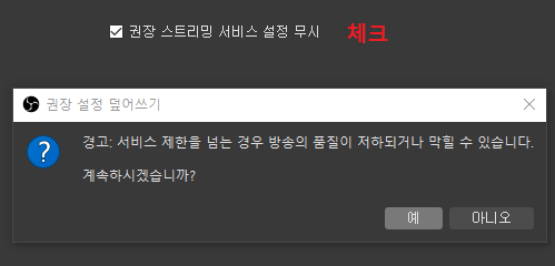 그리고 화질과 관련된 글에서 '권장 스트리밍 서비스 설정 무시' 에 체크하라고 해서 체크한다.