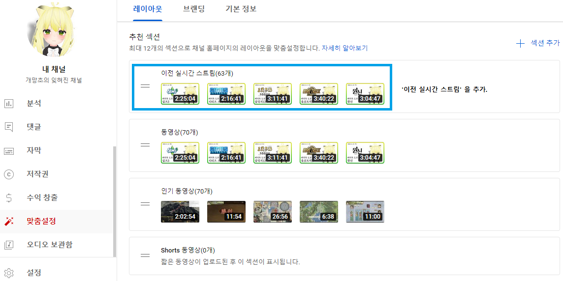 또한 '맞춤설정' - '레이아웃' - '추천 섹션' 에서 '이전 실시간 스트림' 을 추가하고 맨 위에 올려놓았다.