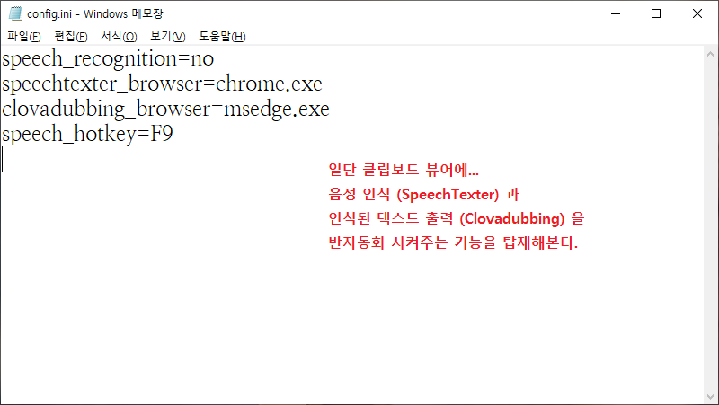 SpeechTexter가 열린 브라우저· 클로바더빙이 열린 브라우저· 단축키 등을 config.ini에서 지정한 뒤, 프로그램 실행 후 단축키를 누르면 바로 SpeechTexter의 브라우저 창이 활성화된 후 마이크 입력을 받게 한다. 그 후 음성 인식된 텍스트가 클립보드로 들어오면, 클로바더빙 브라우저를 활성화시켜서 대사 창에 인식 텍스트를 집어넣게 한다.
