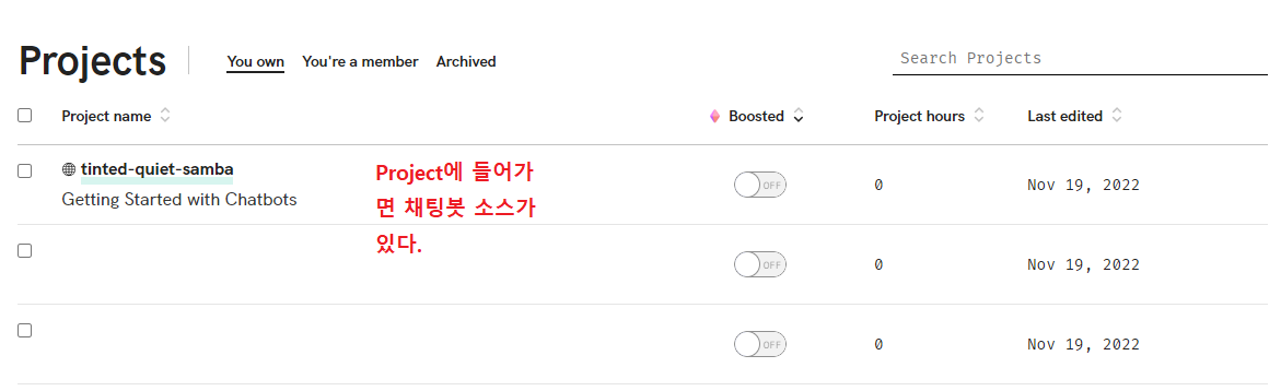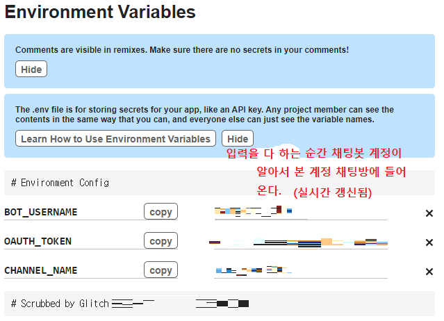 Glitch 창을 꺼버리면 채팅 봇이 잠들어버리는 것이다. 즉, 방송 중에는 Glitch의 채팅 봇 프로젝트를 켜놓아야 채팅 봇이 작동을 하게 된다. (또는 프로젝트명.glitch.me 로 접속하고 있으면 작동된다.)