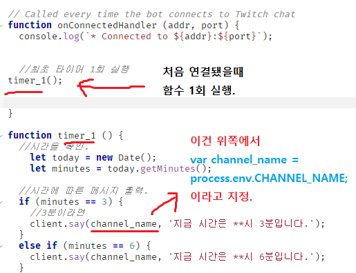 이렇게 하면 채팅봇이 방송 계정 채팅창에 접속 후 타이머 함수를 1회 실시한다.