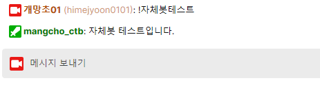 등록하는 순간 채팅봇 계정이 방송 계정 채팅창에 들어오게 된다.