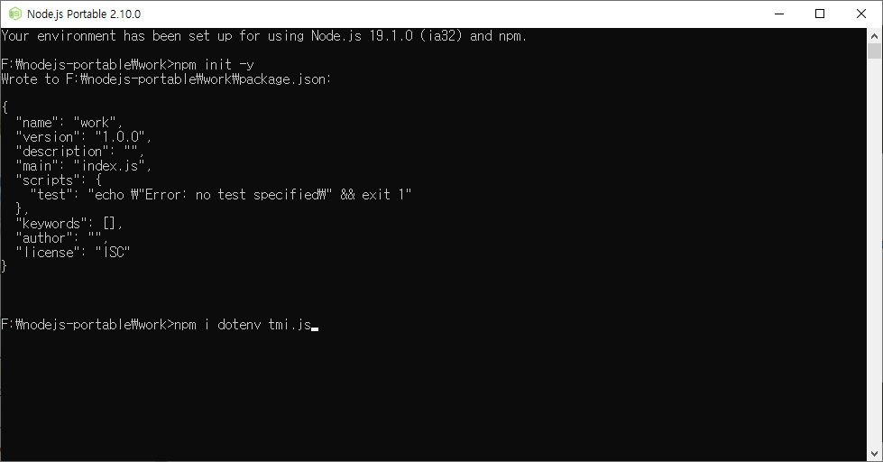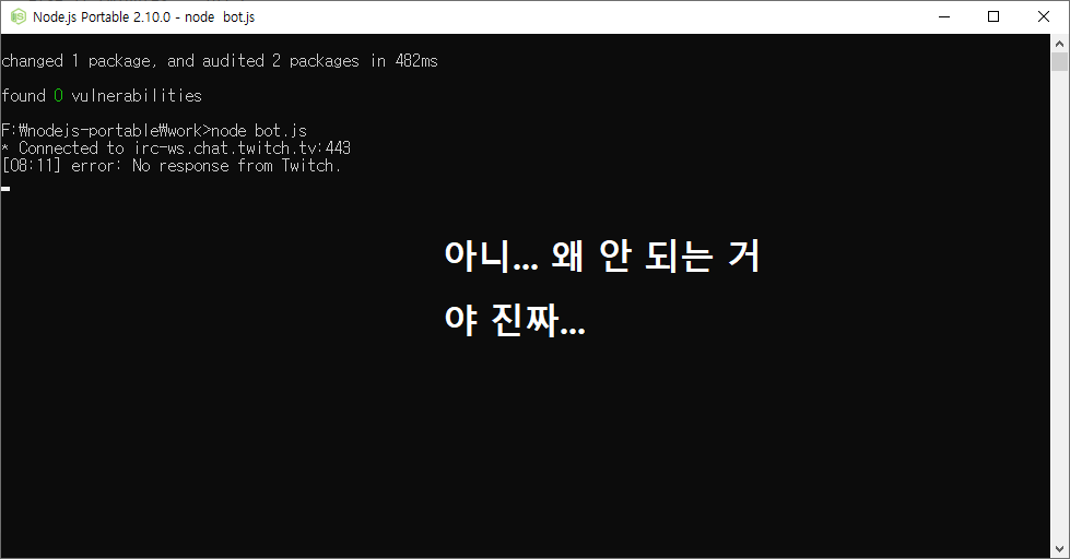 nodejs-portable (링크) 이라는 프로그램을 도입한 뒤 Glitch의 파일들을 컴퓨터에 베껴왔는데, 처음에는 자꾸 트위치 서버가 응답이 없다는 소리만 하면서 실행이 되지 않았다.