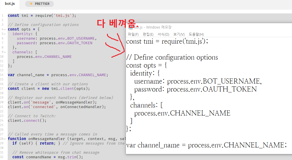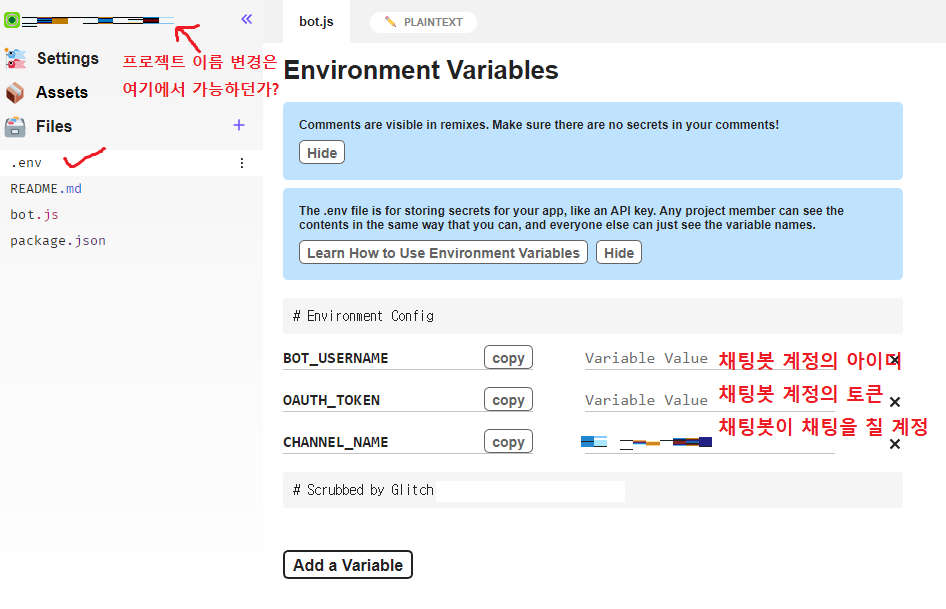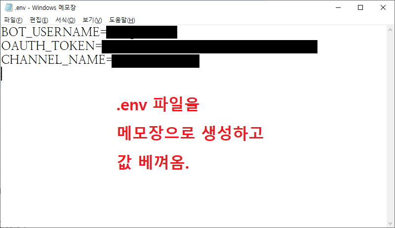 채팅봇을 가동하려면 Files의 .env에다 3가지 값을 적어야 하는데... BOT_USERNAME은 채팅봇 계정의 아이디. OAUTH_TOKEN은 채팅봇 계정의 토큰, CHANNEL_NAME은 채팅봇이 들어가서 채팅을 칠 계정. 즉 방송 계정의 아이디를 말한다.