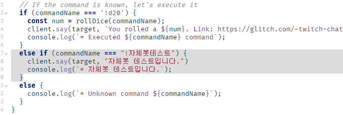 이렇게 else if 문으로 !d20 아래에 인식할 명령어를 넣어주고 대답하게도 해보았다.