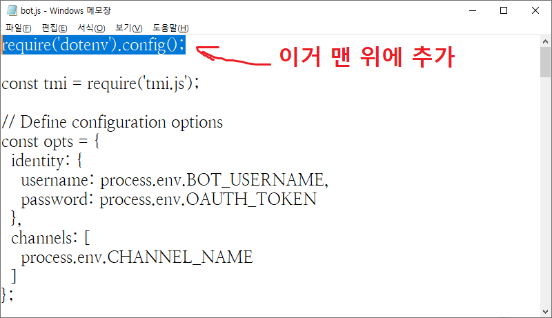이제 채팅봇 계정의 아이디와 토큰, 방송 계정 아이디를 등록한다.
