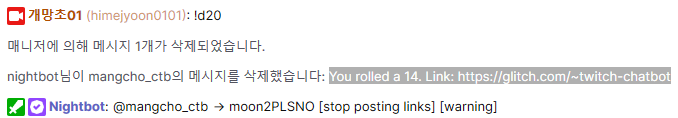 기본으로 들어있는 !d20 이라는 명령어를 사용하니까 바로 인식해서 대답을 해 주었다.