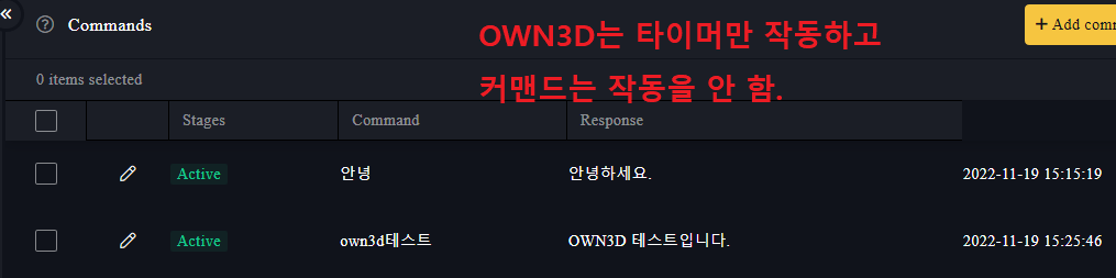 역시 같은 날인 11월 19일. 새로운 채팅봇인 OWN3D와 포사봇(Fossabot)을 영입했다. 다만 OWN3D는 커맨드 기능이 작동하지 않고 타이머 기능만 작동하였다.