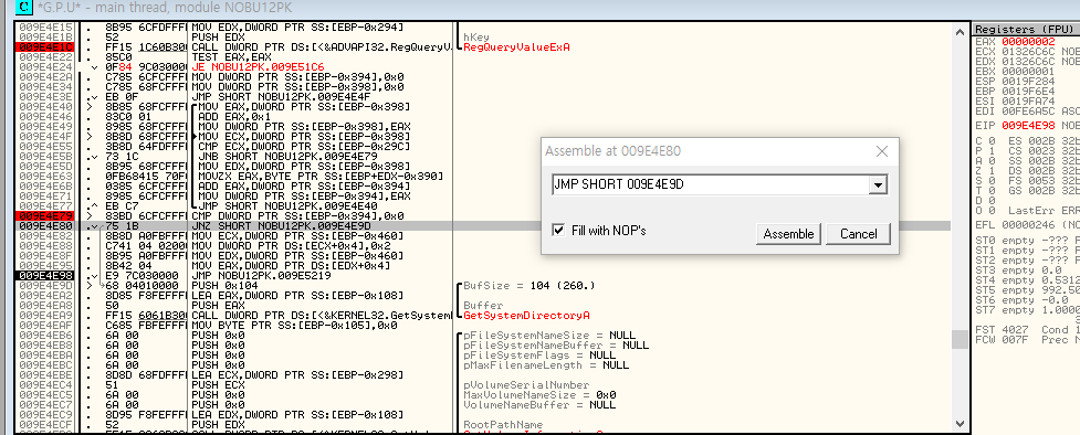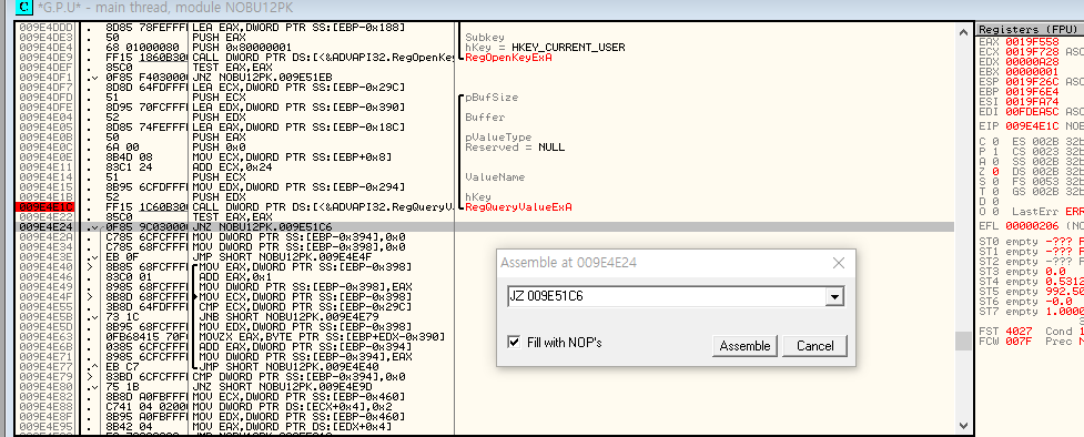 예를 들어, '실행 되는 경우' 에서는 점프를 했는데 '실행 안 되는 경우' 에서는 점프를 안 했다? 그럼 거기 구문을 JMP로 바꿔서 강제로 점프를 시킨다든가... 강제 점프를 해도 안되면 그냥 그 구문을 NOP 처리해서 지워버린다든가 하는 것이다.