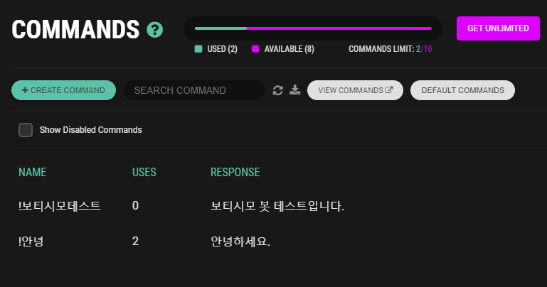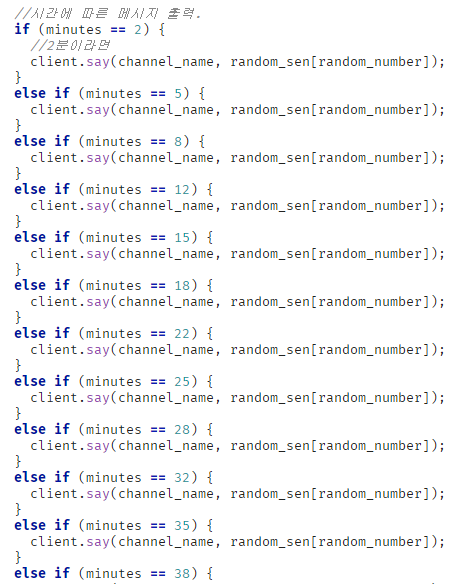 다시 망초채팅봇의 랜덤 대사 패턴을 400개로 늘리고 출력 시간대도 2, 4, 6, 8분대로 증가시켜주었다.