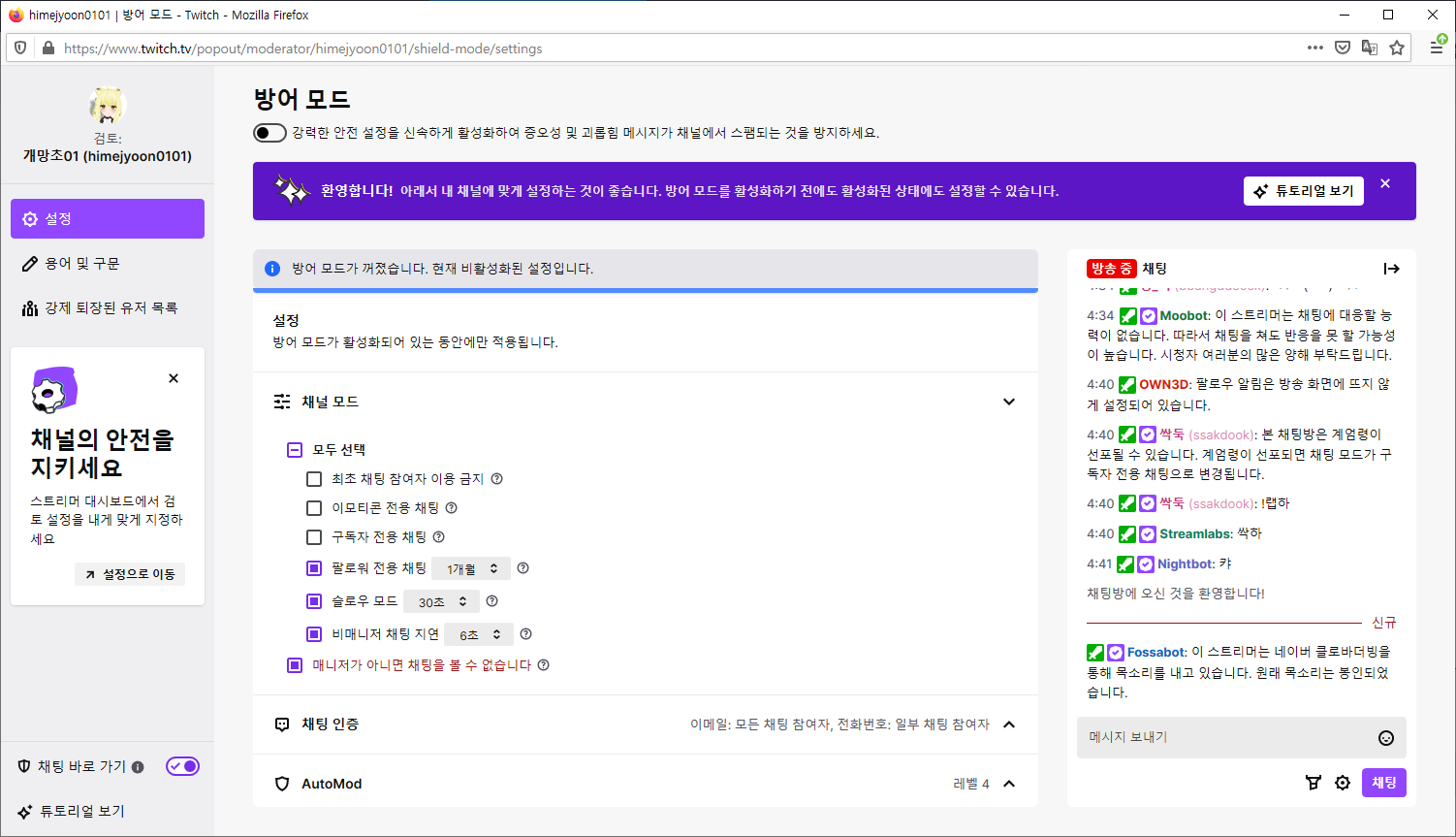 트위치에 방어 모드라는 기능이 추가된 모양이다. 아예 트위치 자체적으로 계엄령 기능이 생긴 것이다.