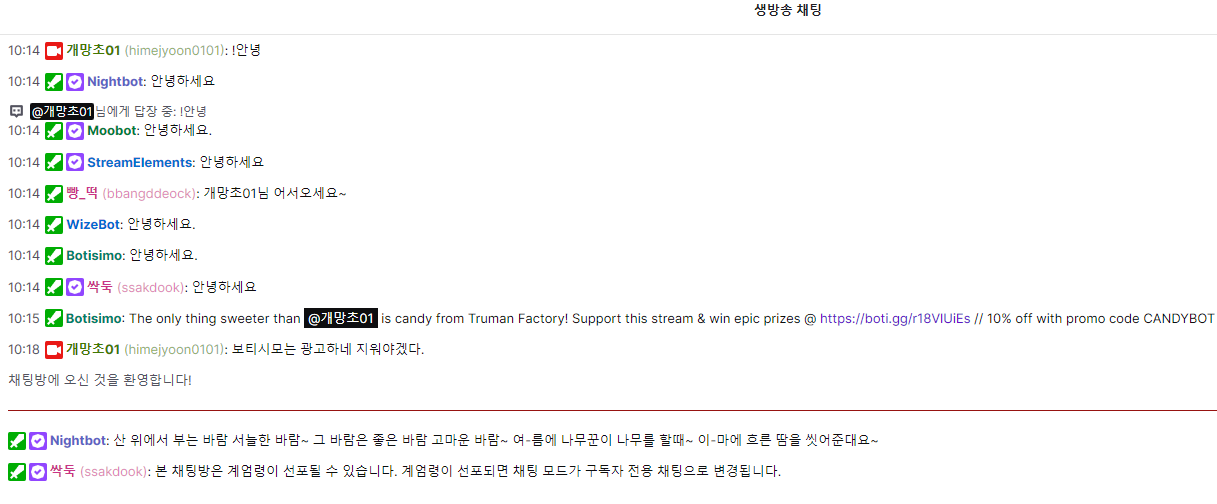 보티시모가 광고를 하는 걸 막기 위해 처음에는 나이트봇의 금칙어로 특정 광고 문구를 추가했다. 그러나 같은 매니저 등급이라서 그런지 나이트봇이 단속을 제대로 하지 못했다.
