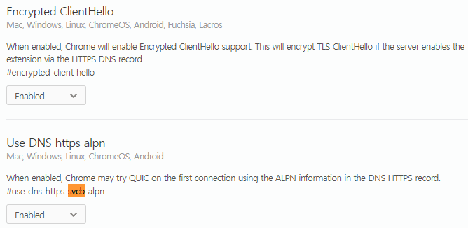 3. #encrypted-client-hello , #use-dns-https-svcb-alpn 항목을 Enabled 한다.