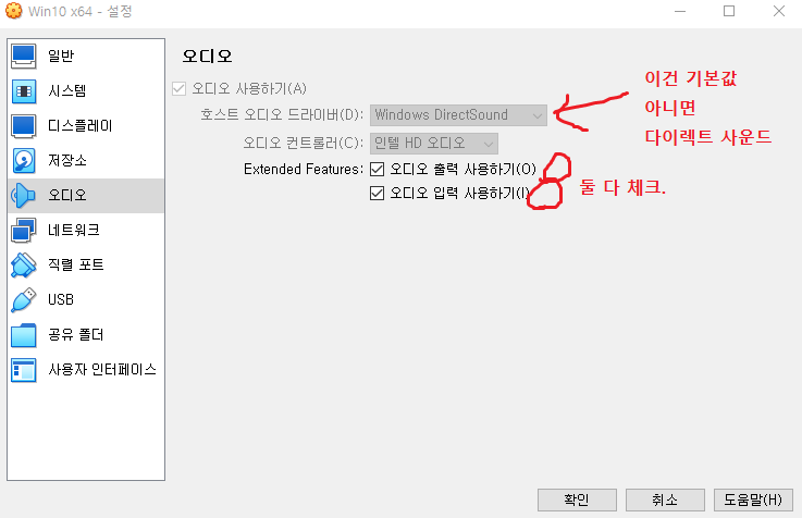 가상머신의 옵션에서 '오디오 출력 사용' , '오디오 입력 사용' 둘 다 체크해놓는다.