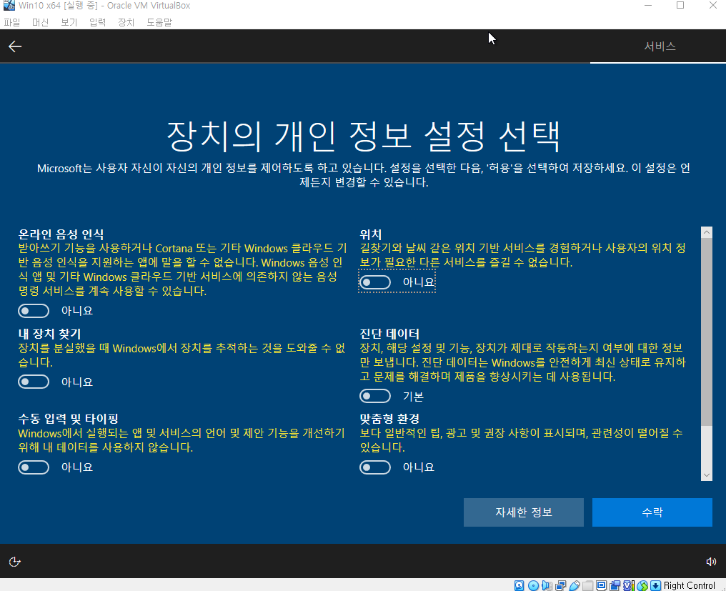 가상머신 환경에서 돌리는 윈도우10은 최대한 최적화를 해줘야 렉이 안 걸린다. 이 게시물을 참고하여 미리 최적화를 실시하였다.