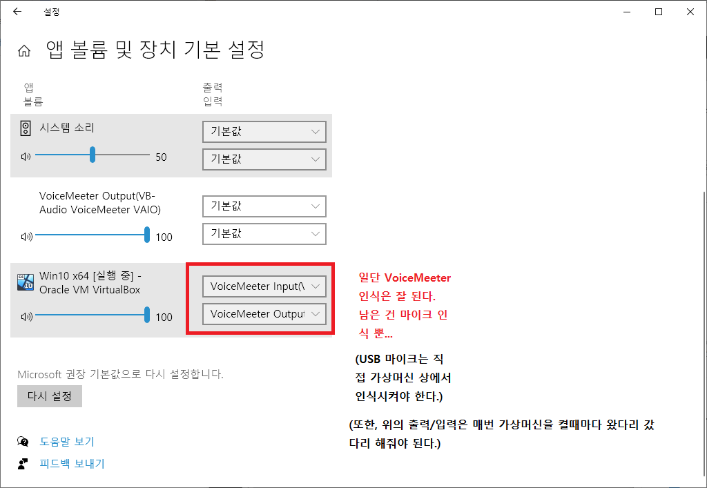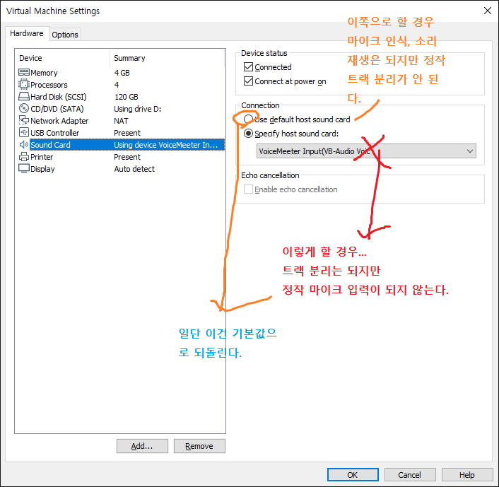 VMware의 사운드 카드를 VoiceMeeter 쪽으로 지정해야 오디오 트랙 분리가 돼서 캐릭터가 입을 벙긋하게 만들 수 있는데, 그렇게 하면 정작 마이크 입력을 받지 못하게 된다.