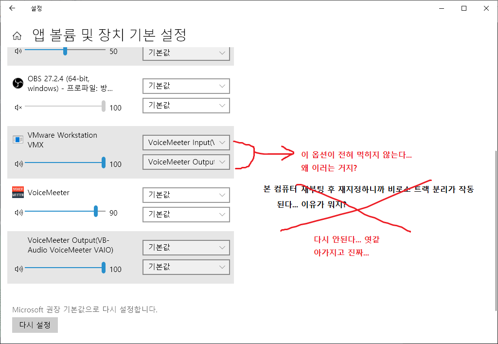바꾼 후 재부팅을 하면 잠시 트랙 분리가 작동하는 것 같지만, VMware를 종료하고 재시작하면 또 풀려서 오디오 트랙 분리가 안된다.