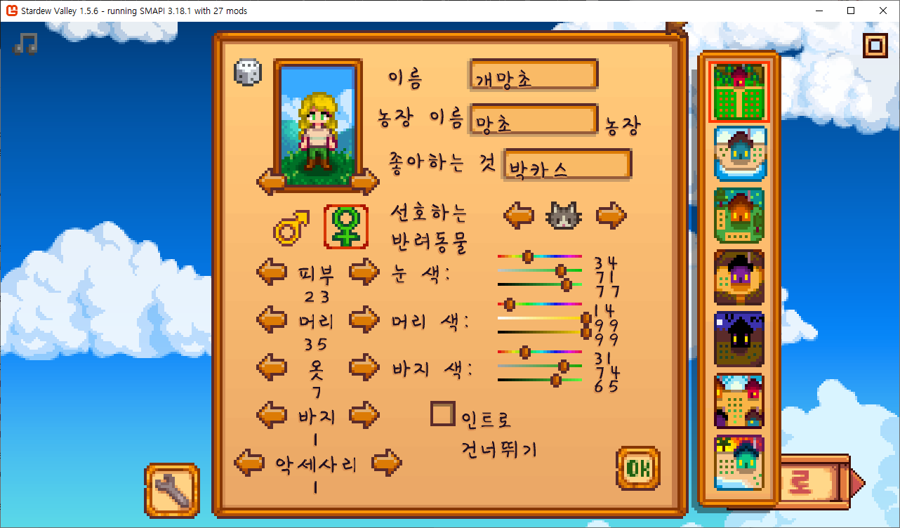 게임의 흥미를 위해 대확장모드 등 여러 모드를 설치하고, 커스터마이징 값도 미리 정해두었다.