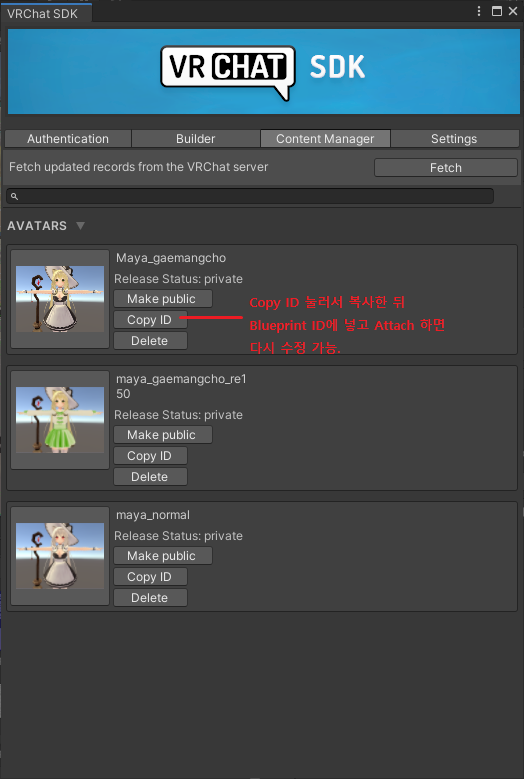 나중에 아바타를 수정할때는 Content Manager에서 Copy ID를 한 다음 아바타의 Pipeline Manager 단락에 넣어주고 Attach하면 되는 것 같다.