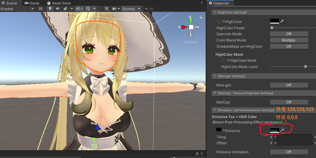 눈 색깔이 갈색으로 나와서 좀 헤매다가 Emissive의 색깔을 0,0,0으로 바꿔주니 녹색으로 잘 변경되었다.