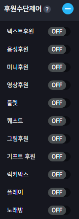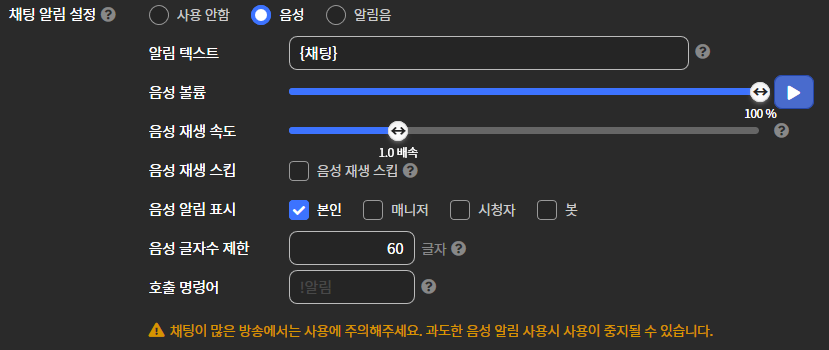 미리 아프리카도우미는 스트리머의 채팅만 읽어주도록 설정하고, 투네이션은 꺼놓는다.