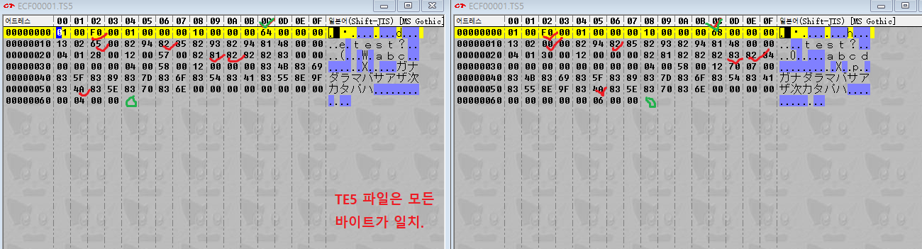 TE5 파일은 모두 바이트가 일치했다. 그렇다면 문제는 역시 TS5 파일에 있는 것으로 보인다.