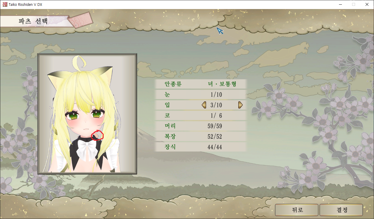 이렇게 한 뒤 여무장 파츠의 머리 59, 복장 52로 지정하면 신무장의 얼굴이 뜬다.