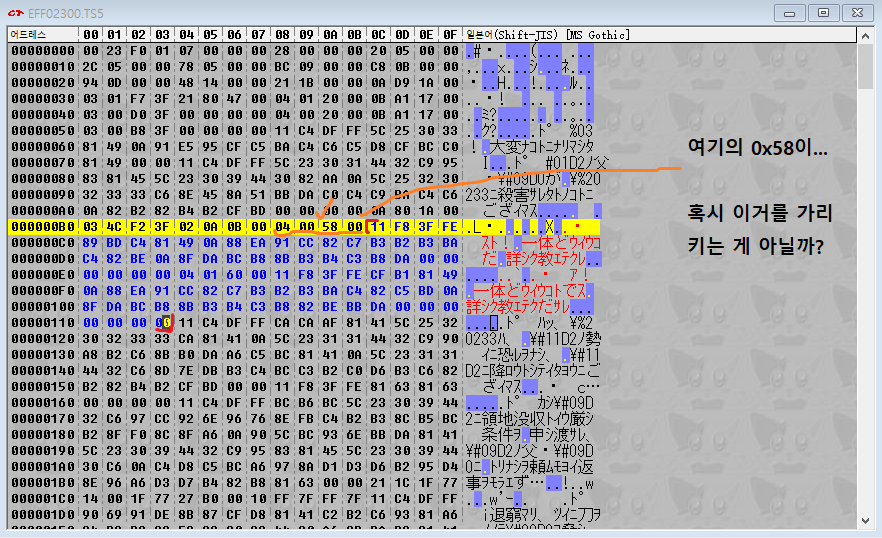 ...이런 과정으로 작동하는 것 같다. 바이트를 이동한 자리에는 11, 12, 13 같은 대사 바이트가 나와야 한다.