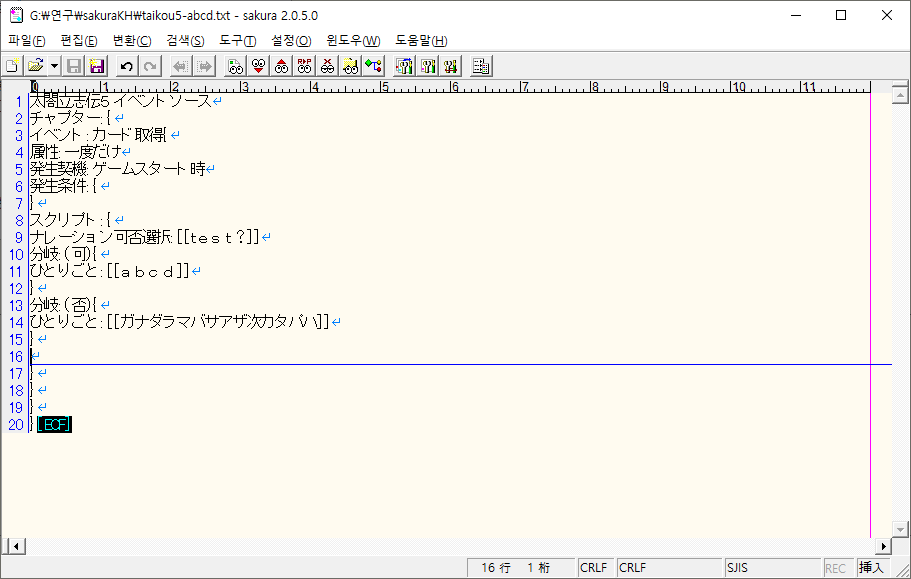 Shift_JIS 인코딩을 지원하는 텍스트 에디터 (사쿠라 에디터) 를 열고, 다음과 같이 2개의 내용을 작성했다.
