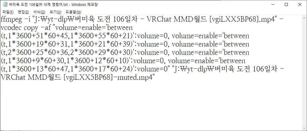 volume=0은 음량을 0으로, 즉 영상의 1:51:45~1:55:21 시간대를 음소거 처리하라는 뜻이다.