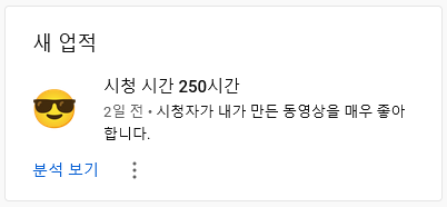 유튜브 채널의 시청 시간 250시간을 달성했다는 알림이 떴다.