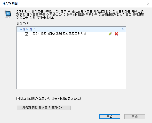 NVIDIA 제어판의 '사용자 정의 해상도 만들기...' 기능을 통해 1920x1080 해상도를 추가하였다.